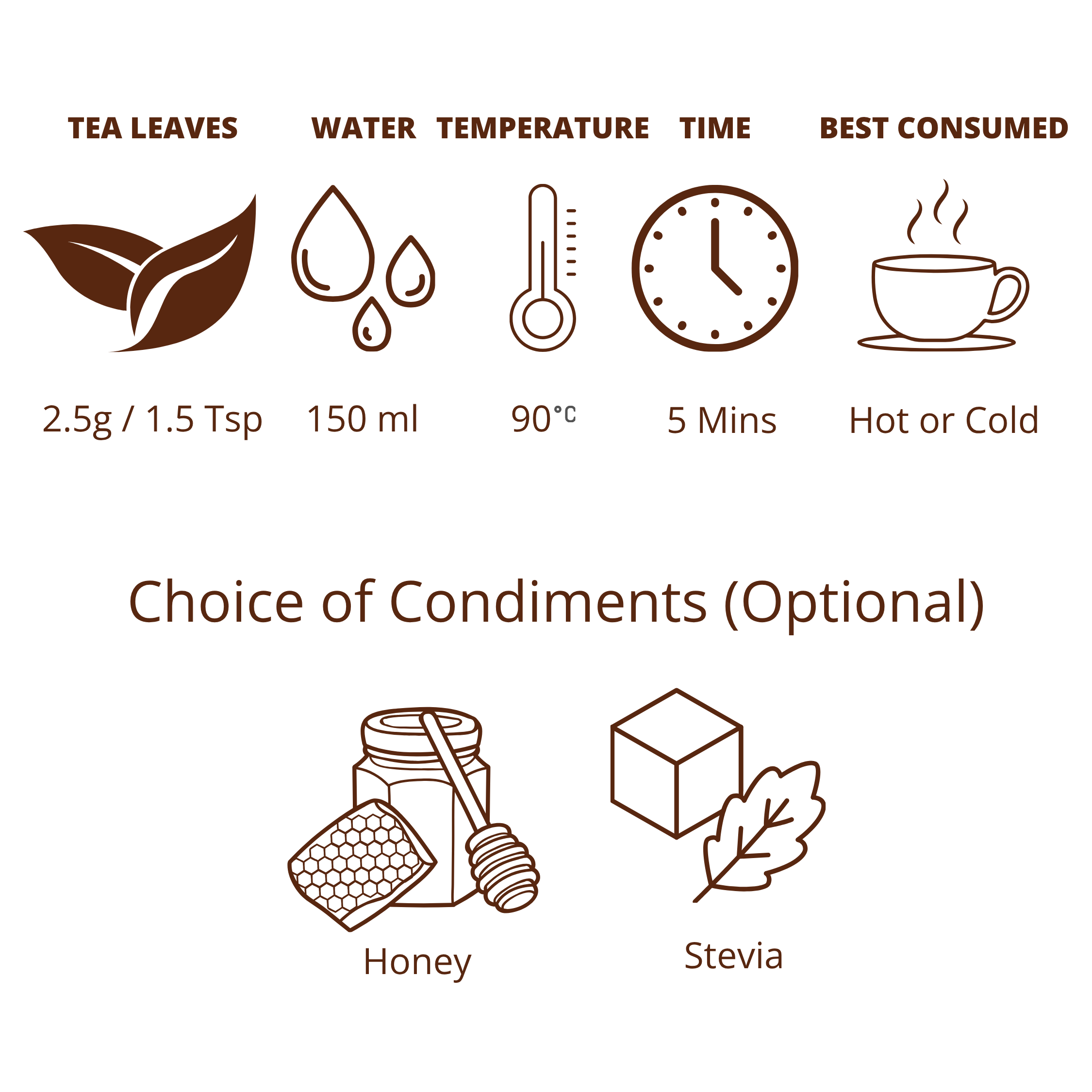 Steep 1–2 teaspoons in hot water at 90°C for 4–5 minutes.